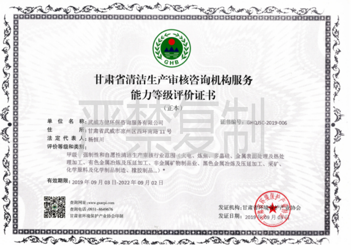 持有的资质证书---我公司取得《甘肃省清洁生产审核咨询机构服务能力评价证书》甲级,(证书编号:GHQJSC-2019-006号)、《甘肃省建设项目环境监理能力评价证书》甲级(GHJ-2019-004号)、《甘肃省环境污染治理工程服务能力评价证书》甲级(证书编号GHGC-2020-021)。